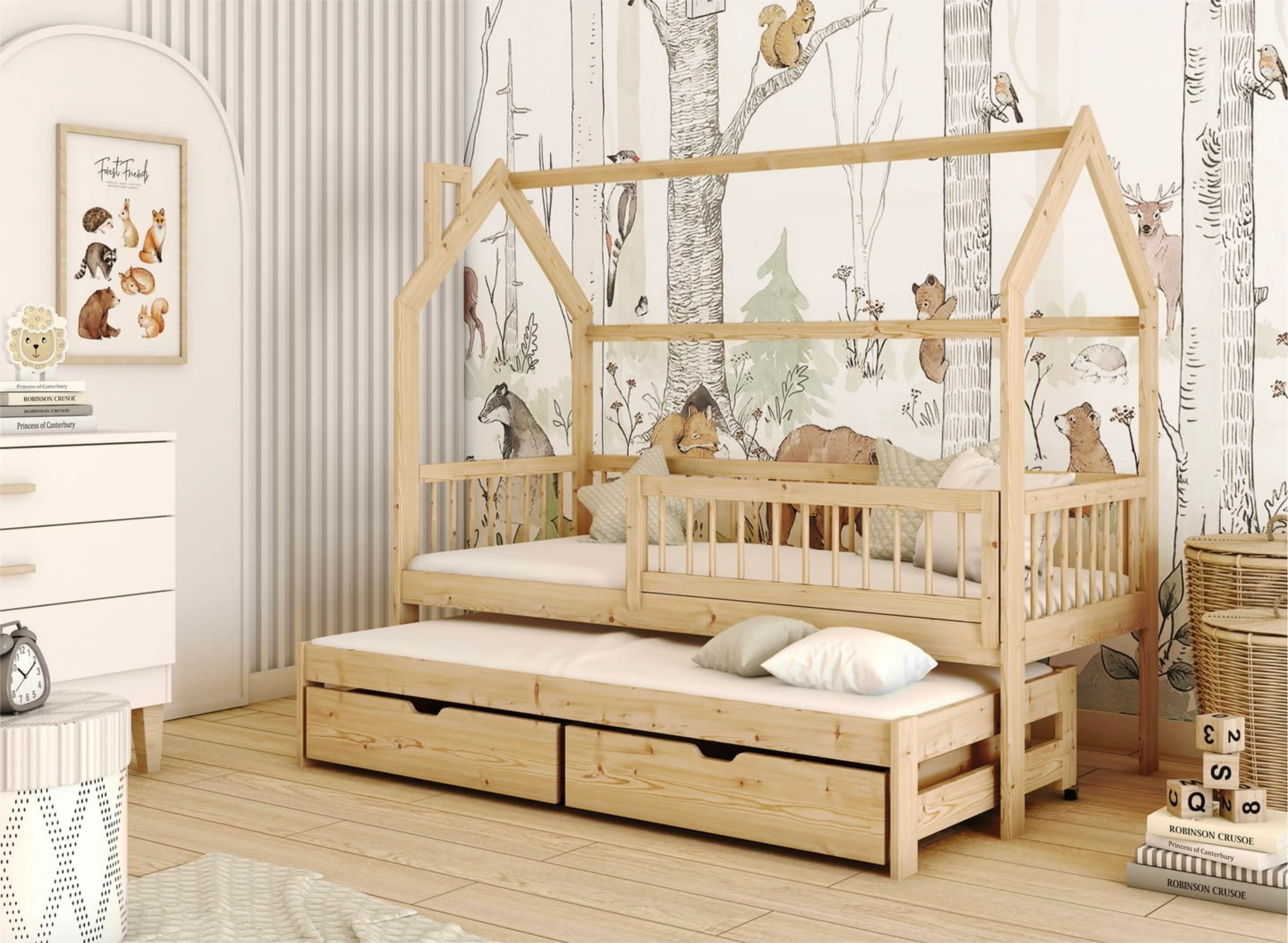 The PAPI 80×170 pine bed blends perfectly with warm textiles, natural baskets, and wooden décor. Its versatile size makes it ideal for compact rooms, while drawers and a pull-out bed improve space organisation. It’s a practical and charming centrepiece for any child’s room.
