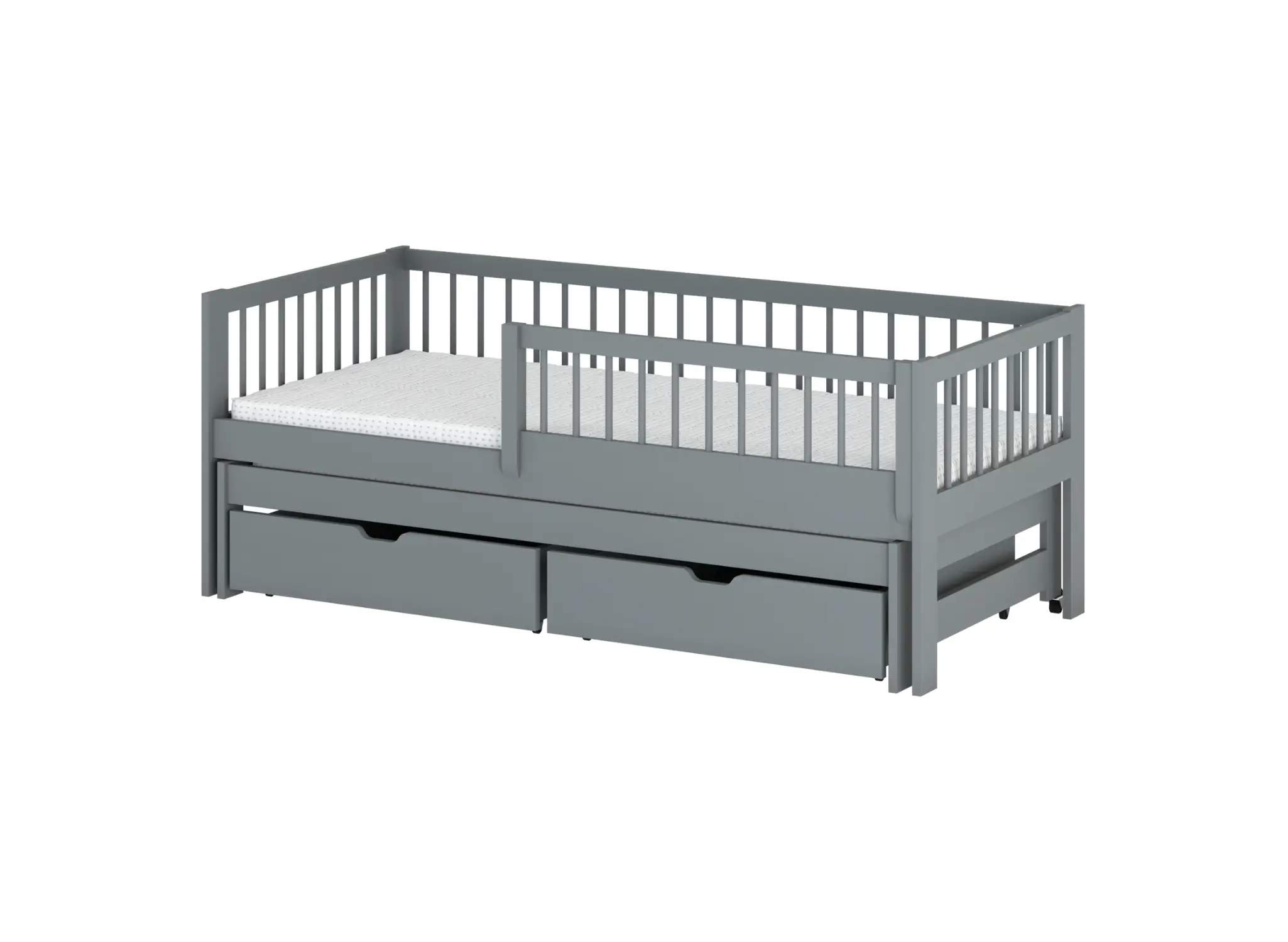 The SOFTI children's bed is a piece of furniture that will make your child smile every day. Its stable construction ensures durability for years. The secret of the design is its simple form, which is made of pine wood. In addition, you will certainly appreciate the universal design of the SOFTI children's bed. It will fit into any children's room arrangement and any style. You don't have to worry that it won't match the rest of the furnishings after a renovation, for example. Don't wait and take advantage of this great offer from Lano Furniture now. At Lano Furniture, we make sure that our products impress not only with their appearance, comfort, and functionality but also with their safety. That is why the SOFTI children's bed is made of high-quality pine wood, covered with a health-safe varnish. The wood is antistatic and does not attract dust. The edges of the bed and all critical parts are rounded, which eliminates the risk of abrasions. The icing on the cake is the protective railings, which protect the child from getting out of or falling out of bed during sleep.