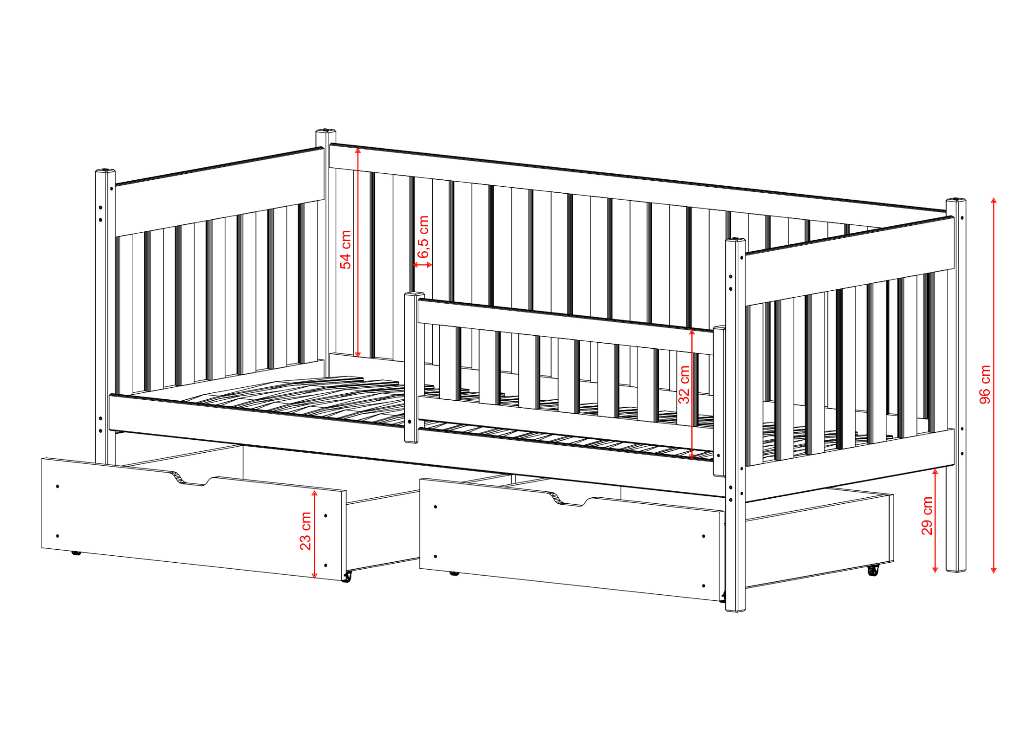 Has your little one outgrown their baby cot? We have the perfect solution for you—the ALICJA children's bed from Lano Furniture. Sooner or later, every parent starts to wonder when to change a baby's cot. In fact, a one-and-a-half-year-old child is already ready for the change. This is the age when your little one is independent enough to get into and out of bed safely without your help. Children are curious. You're probably aware that they will climb everywhere. That's why, at a certain point, a baby's cot can be dangerous. A child might be too eager to climb the rail. The ALICJA children's bed, thanks to the wooden rail mounted on only half of the frame, ensures your child's safety during sleep. At the same time, it allows for free and, most importantly, safe exiting from the bed.