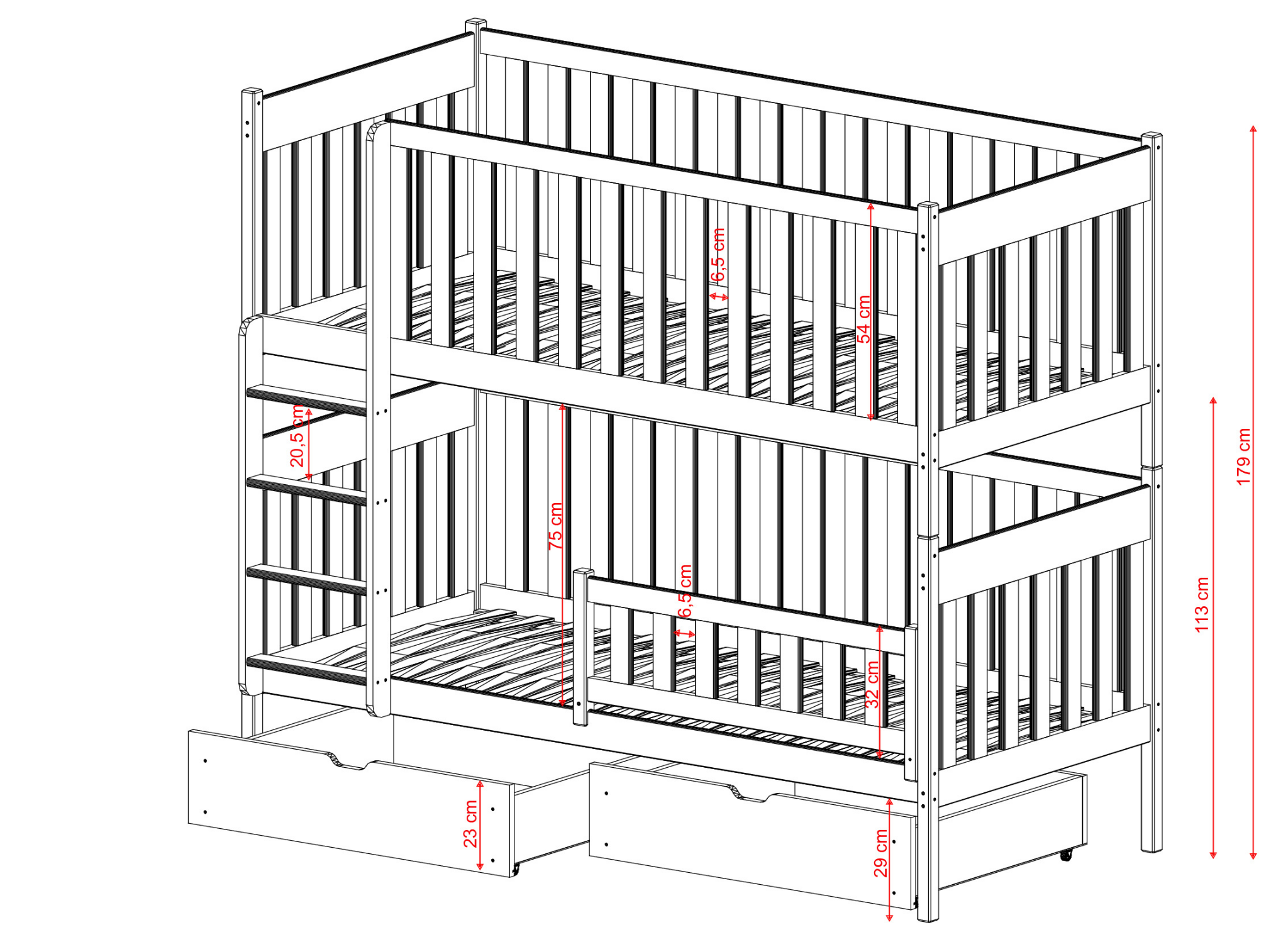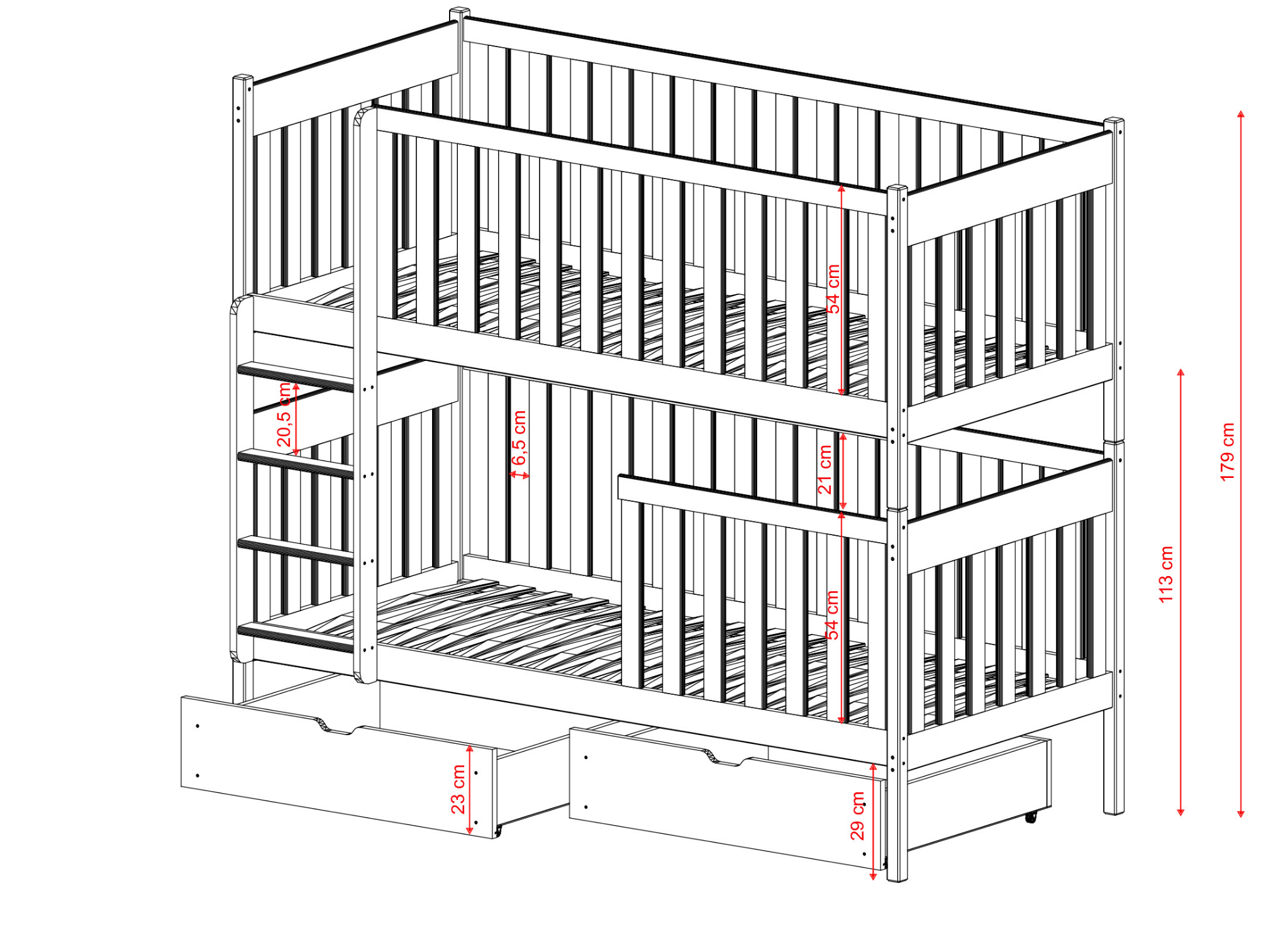 Finding enough space for toys and bedding is a challenge in every home. Approach this cleverly and choose a children's bed that can accommodate siblings and also provide spacious drawers for treasures. You can configure our DAWID bunk bed, choosing, among other things, whether there will be space for drawers under the bottom mattress. Select the other parameters (built-in or removable railing) and order the DAWID children's bed today, which your children will love!