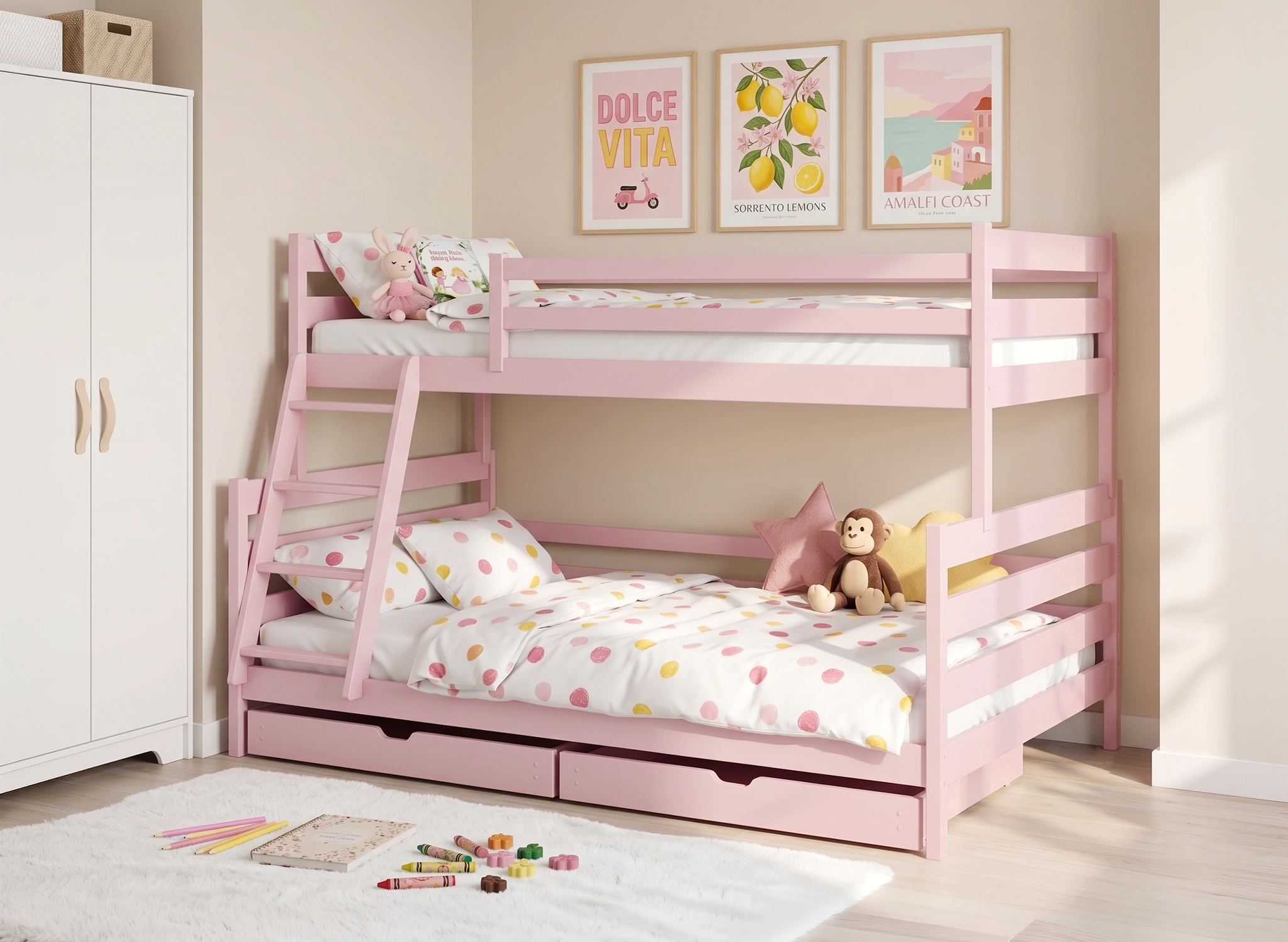 Looking for a safe children's bed that is also stylish? Check out the pink FAMI bunk bed model