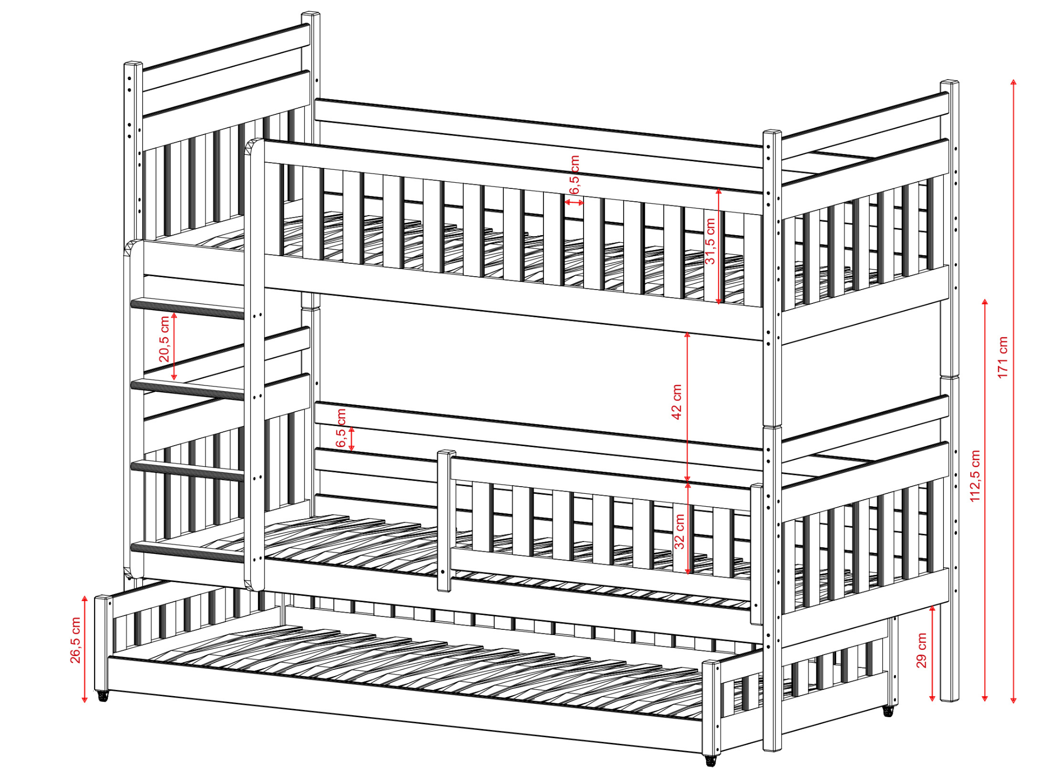 Do you have three children who share one children's room? Are you looking for practical solutions? If so, we have what you're looking for. Our OLIWIA bunk bed combines two solutions, which allows it to accommodate three children. The OLIWIA bed for siblings is a bunk bed that has a hidden pull-out, independent third bed in the bottom section. When you choose our OLIWIA bunk bed, you decide how to install the safe rails and also on such an important parameter as the type of mattress. Thanks to this customisation, you can easily adapt the OLIWIA bunk bed not only to the age but also to the requirements and physical characteristics of your children.
