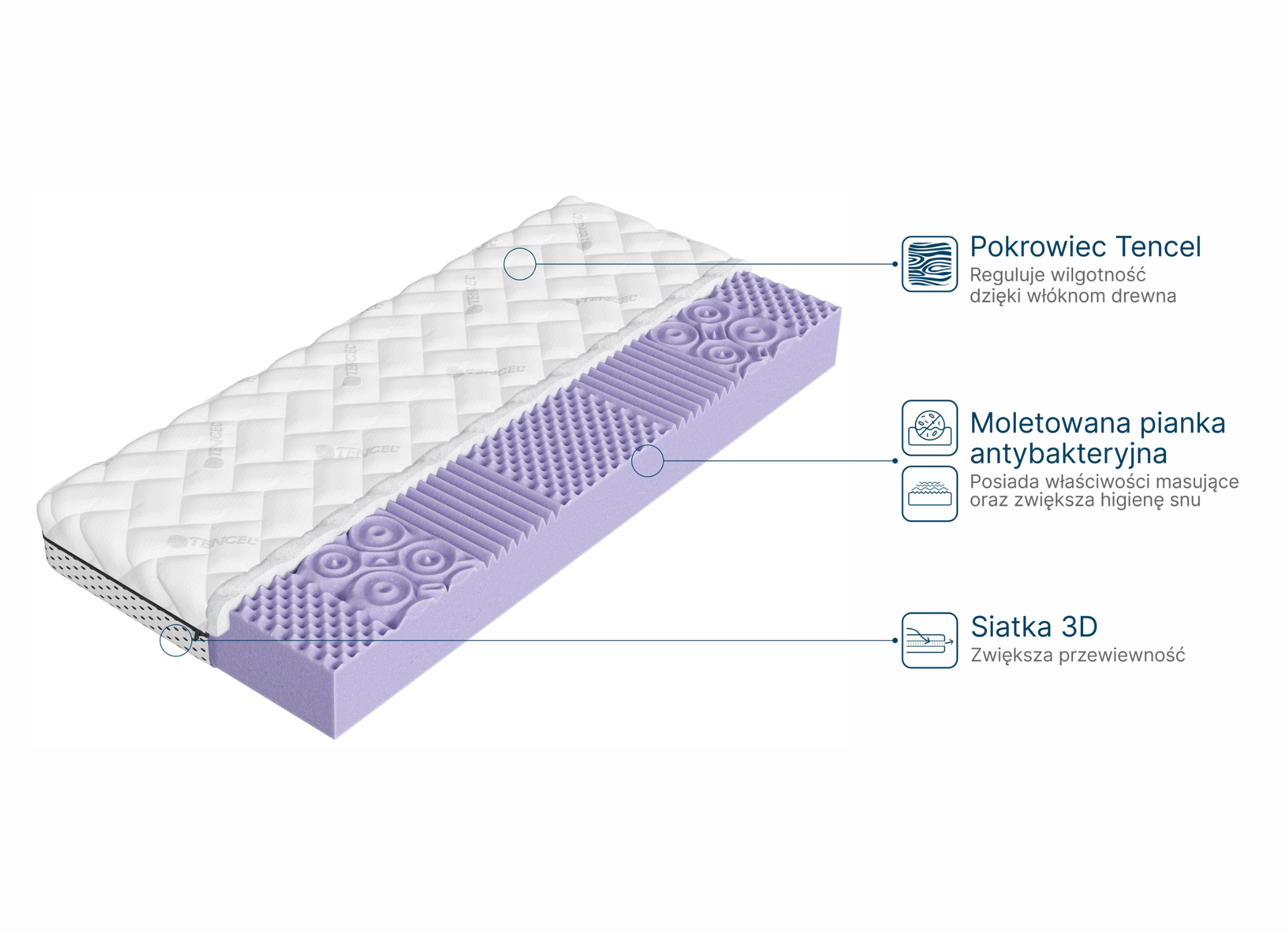 - has a rich interior It features a Tencel knitted fabric that quickly absorbs moisture, maintaining sleep hygiene.