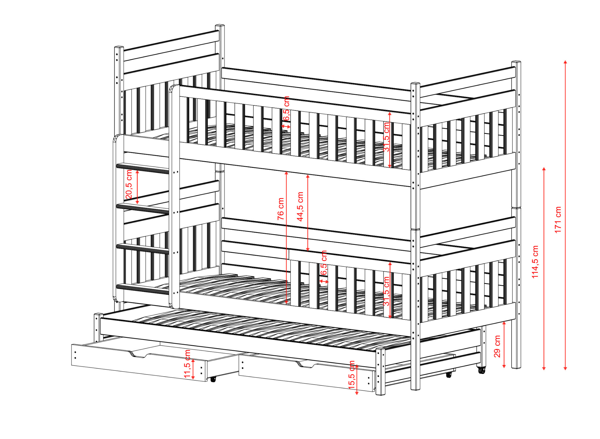 Patul supraetajat KLARA de la Lano Meble este produs cu atenție la fiecare detaliu, chiar și la cele mai mici. Materialele pe care le utilizăm sunt de cea mai înaltă calitate, pentru că dorim să asigurăm copilului tău un somn sănătos și liniștit. Patul supraetajat KLARA este o propunere interesantă pentru dormitorul copilului amenajat în stil clasic. Rama clasică a patului supraetajat KLARA va constitui un accent interesant în regatul copiilor tăi. Lemnul de pin protejat cu vopsea antialergică va asigura durabilitatea patului supraetajat KLARA pentru mulți ani. KLARA este un pat supraetajat pentru trei persoane, care va satisface nevoile chiar și celor mai exigente mici. Barierele de protecție sunt disponibile în două variante – montate permanent sau detașabile. Această ultimă opțiune îți permite să demontezi bariera în timpul zilei, când copiii doresc pur și simplu să se joace. O poți monta pe timp de noapte, pentru ca micuțul tău să fie în siguranță în timpul somnului. În patul supraetajat KLARA există de asemenea loc pentru un saltea confortabil pe platforma extensibilă. Aceasta este o propunere interesantă când ai copii de vârste apropiate sau când primești frecvent oaspeți.