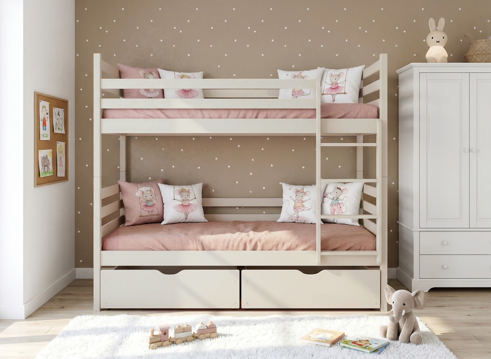 The NEMO bunk bed is made of 100% pine wood. In practice, this means that the bed is extremely solid and stable. Additional protection in the form of wooden barriers protect the child during sleep and provide peace of mind for parents. If necessary, the lower barrier can be removed. The boards are secured with special varnishes safe for the child's health. In addition, all corners of the furniture are rounded, so the risk of abrasions is almost zero.